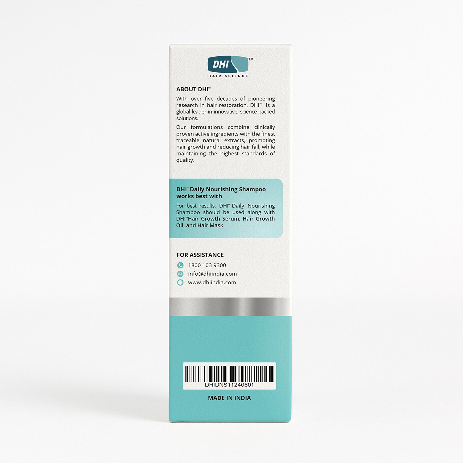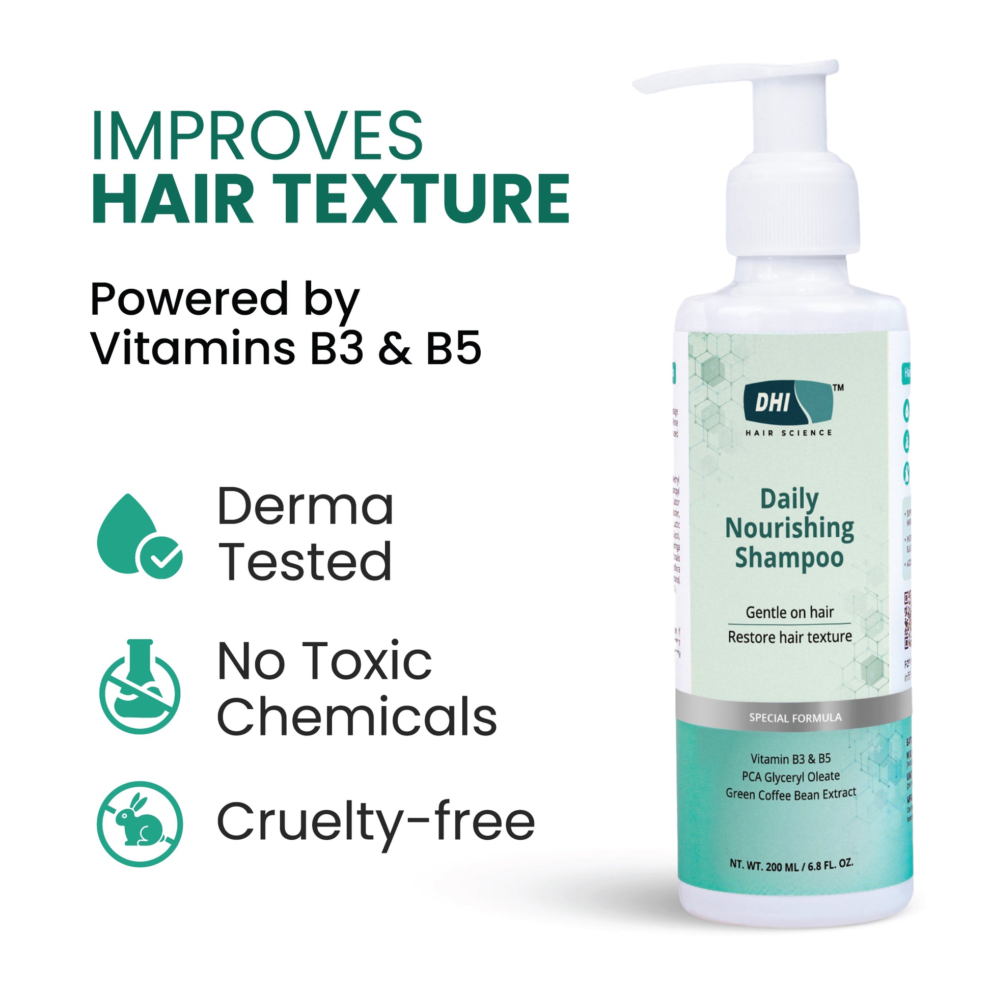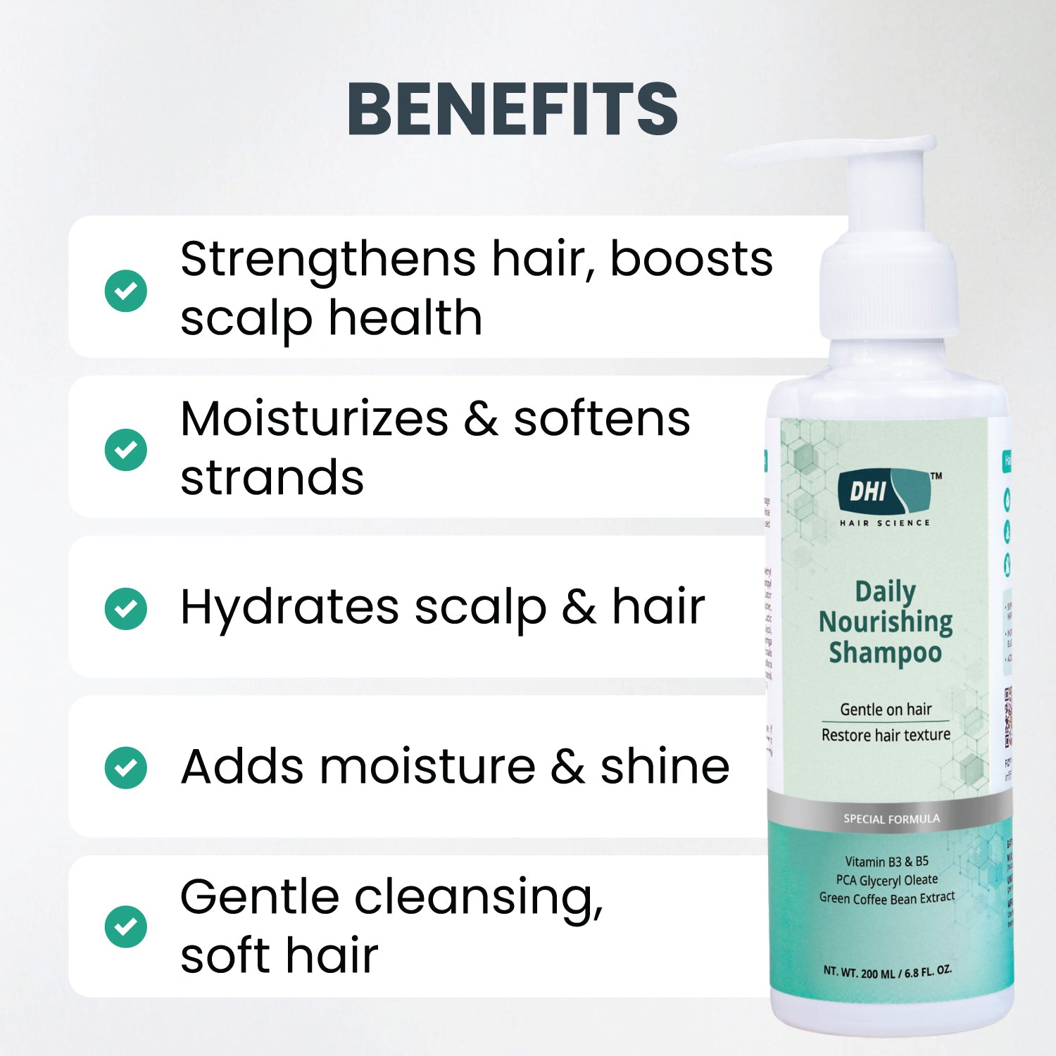 DHI Daily Nourishing Shampoo is formulated with polysaccharide hydrate to moisturize your hair while reducing scalp irritation. A special PCA & Olive Oil complex protects and soothes the scalp, while natural antibacterial agents promote a clean, healthy scalp environment.