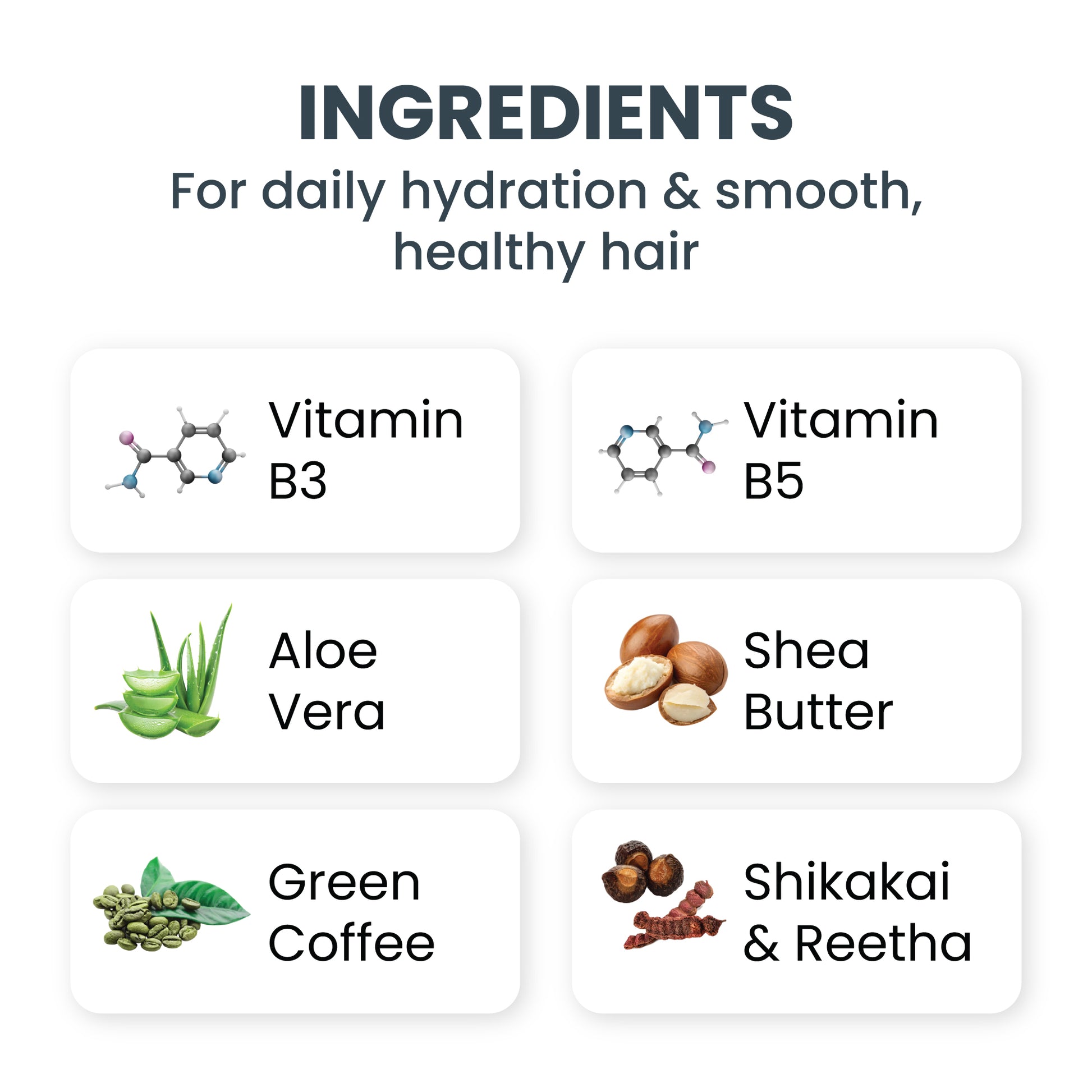 Aqua, Sodium Lauroyl Sarcosinate, Cocamidopropyl Betaine, Acrylate Copolymer, Glycerine, Sodium Methyl Cocoyl Taurate, Decyl Glucoside, Betaine, Sodium Cocoyl Isethionate, Polyquaternium 39, Polyquaternium 22, Polysorbate 20, Polyquaternium 7, Niacinamide, Panthenol, Aloe Vera Leaf Pulp, Shikakai Extract, Reetha Extract, Green Coffee Extract, PCA Glyceryl Oleate, Saccharide Isomerate, Shea Butter, PEG-150 Distearate, Phenoxyethanol, Ethylhexylglycerin, Citric Acid, Sodium Citrate, Sodium Gluconate, Parfume.