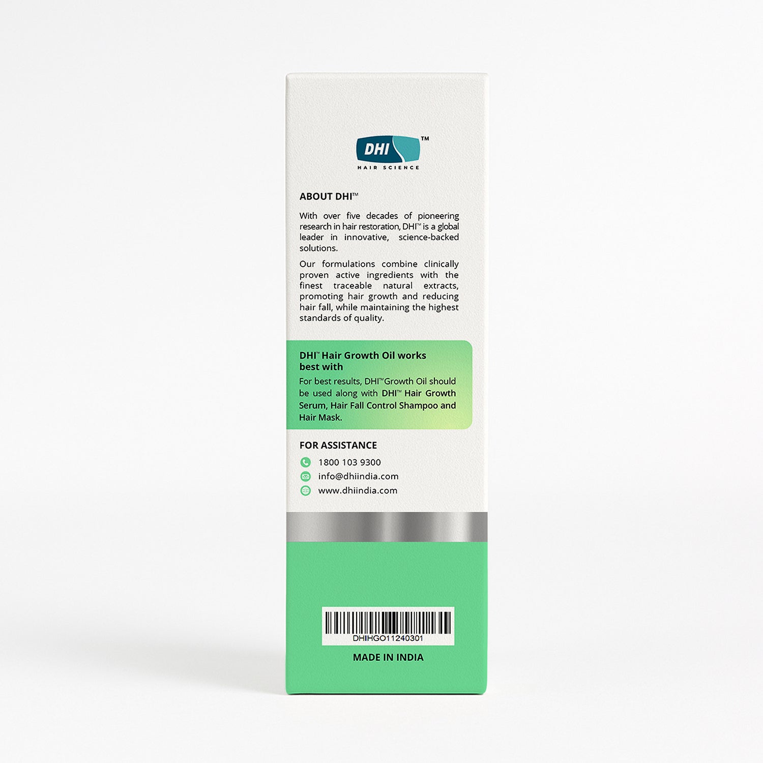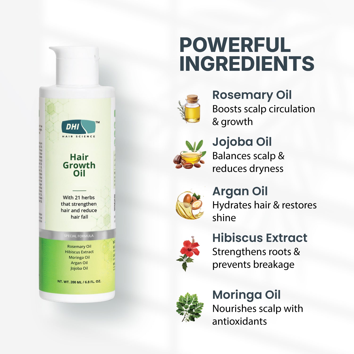DHI Hair Growth Oil is a nourishing unique blend of 21 Ayurvedic herbs including Rosemary, Hibiscus, Moringa, Argan, Sesame, and Jojoba Oil, this deeply nourishing oil helps target the root causes of hair fall while promoting healthy hair growth. Its antioxidant-rich formulation improves scalp circulation, it helps reduce hair fall, improve thickness, and restore natural shine for stronger, healthier-looking hair.