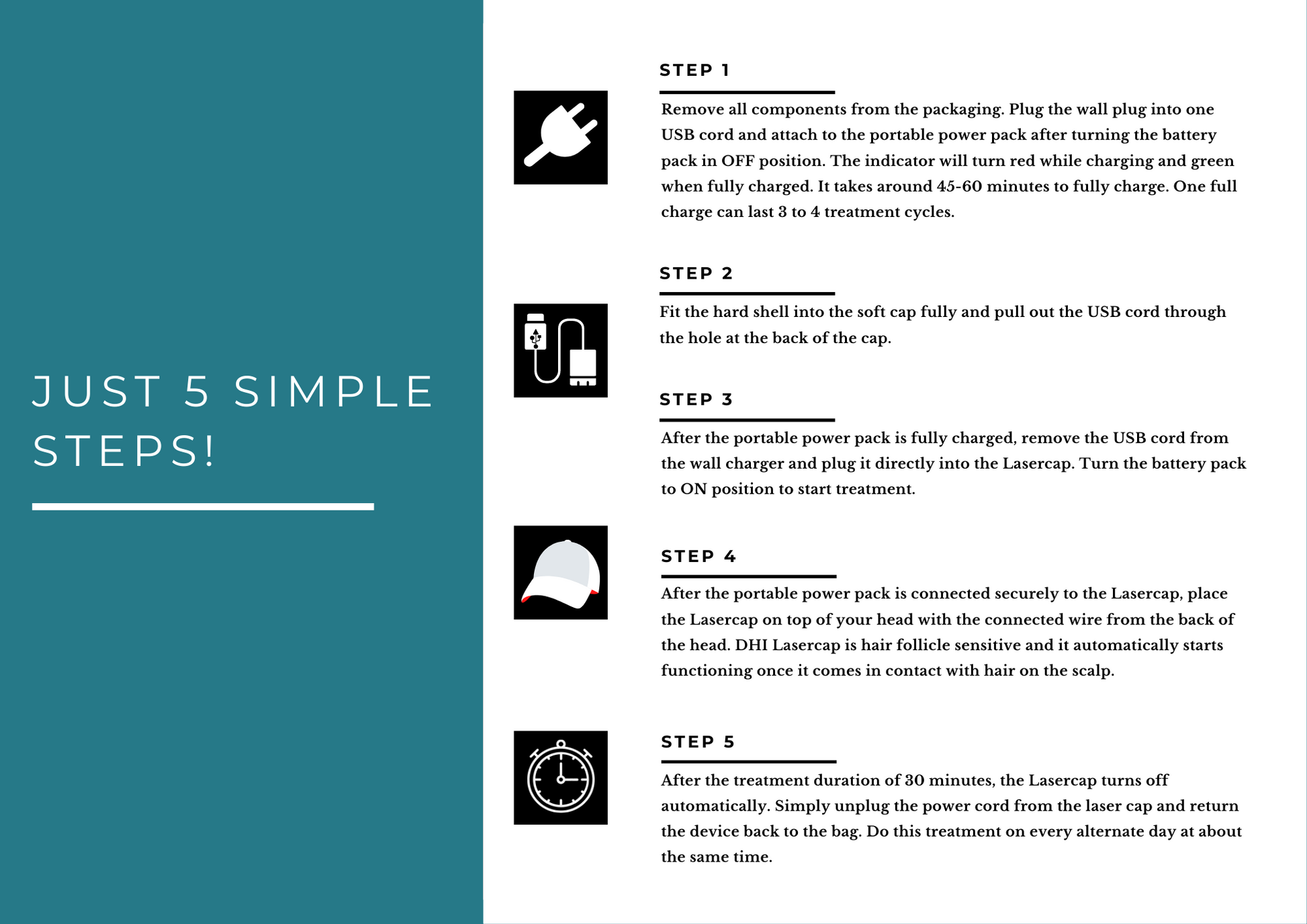 - Use DHI's laser cap with the charger and battery provided in the box.