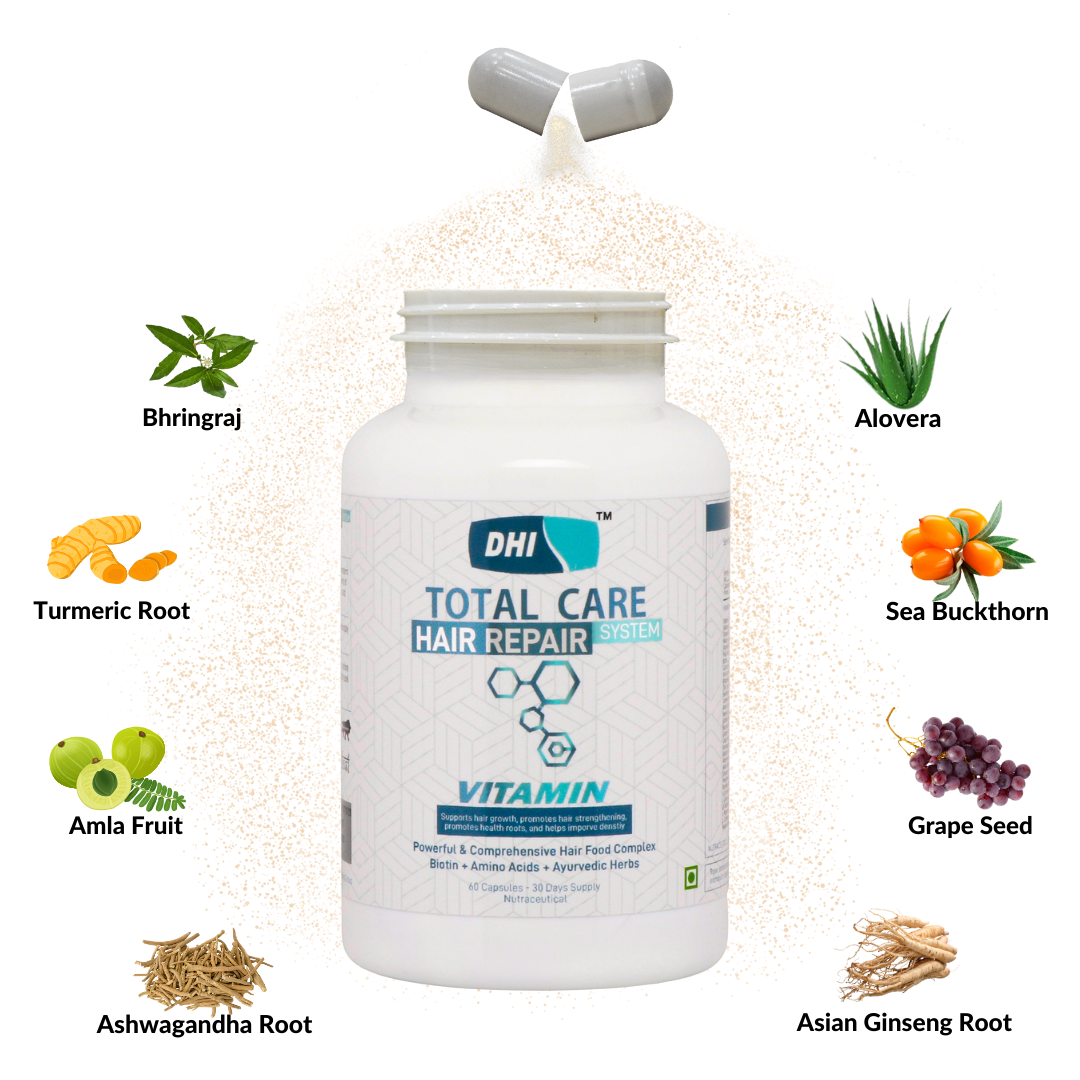 Hair Repair Vitamin: DHI Multivitamins are made with Biotin, Amino Acids, and Ayurvedic herbs. Combining these ingredients, our multivitamin capsules provide comprehensive support to address various hair fall issues, resulting in stronger, healthier hair and reduced shedding.